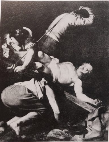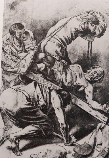 Gerard van Honthorst maakte 16 jaar na Caravaggio zijn eigen versie (tekening) van 'De kruisiging van Sint Petrus'.